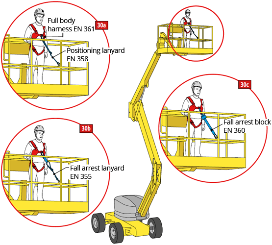The simplest solution to prevent the operator from being thrown off the platform is to use personal fall protection equipment — specifically, a fall restraint system. The restraint system for mobile elevating work platforms consists of a full body harness (EN 361) and an adjustable work positioning lanyard (EN 358) (fig. 30a). By connecting the positioning lanyard to the platform’s anchorage device and adjusting the length, the risk of falling over the guardrail can be eliminated, even during severe vertical oscillations.