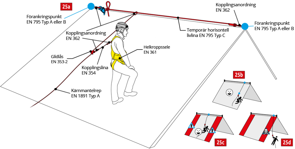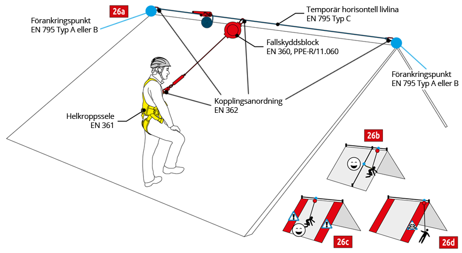 På tak och terrasser kan med fördel en temporär eller permanent horisontell livlina EN 795 Typ C eller Typ D (permanent av skena) användas som en förankringsanordning som ger användaren horisontell rörelsefrihet. För rörlighet och säkerhet under arbetet kan ett falldämpande system bestående av helkroppssele EN 361 och glidlås EN 353-2 på kärnmantelrep EN 1891 Typ A som är fäst vid förankringsanordningen användas (fig.25a). Användaren kan röra sig fritt och glidlåset fångar upp användaren vid ett fritt fall och begränsar fallets längd. Viktigt att beakta systemets fria höjd så att användaren ej slår i marken eller underliggande hinder vid ett fritt fall. Nära sidokanter där det finns risk för fritt fall med pendeleffekt (fig.25c-d), måste en extra förankringsanordning EN 795 Typ A (permanent) eller Typ B (temporär) användas (fig.25b) eller att förankringsanordningens läge ändras som förhindrar en farlig pendeleffekt.