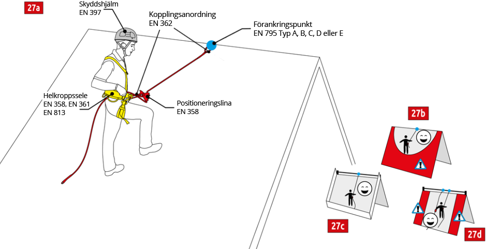 Med fördel används ett arbetspositioneringssystem bestående av en helkroppssele EN 361 med inbyggt stödbälte EN 358 och sittsele EN 813 samt justerbar positioneringslina EN 358 där användaren håller systemet under konstant spänning. Systemet kopplas i en förankringsanordning EN 795 Typ A, B, C, D eller E (fig.27a). Den justerbara positioneringslinan utför inte den kritiska funktionen som ett falldämpande system (dvs fångar upp ett fritt fall), därför måste arbetspositioneringssystemet användas så att förankringsanordningens läge tillsammans med positioneringslinans längd förhindrar arbetaren från att nå takets kanter och utsättas för ett fritt fall (fig.27b) och går ej det kan man kombinera positioneringslinan med ett kollektivt fallskydd (tex skyddsräcke) som förhindrar möjligheten att falla vid takets kanter (fig.27c) eller kombinera positioneringslinan med ett falldämpande system, tex glidlås EN 353-2 på kärnmantelrep EN 1891 Typ A eller fallskyddsblock EN 360(fig.27d).