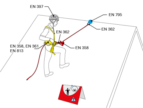 Note: Connectors must be attached to both the anchor device and the harness using a connector in accordance with EN 362. If the user connects directly with an EN 362 connector to a static structural element (e.g., scaffolding tube, ladder rung, or truss brace), and not to an EN 795 anchor device, it is critical to ensure the minimum structural strength. The required minimum strength is specified in the connector’s user instructions and is at least 10 kN (1000 kg).