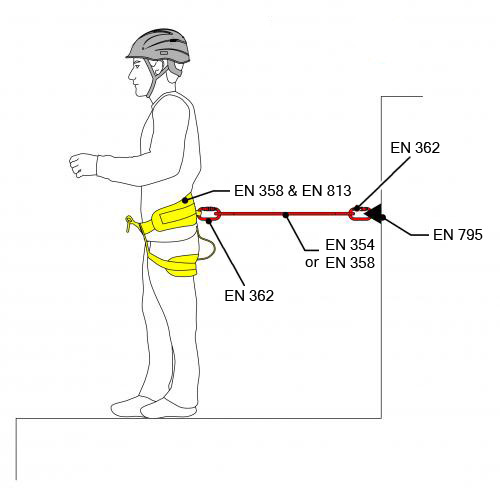 - The system is assembled so that the total length of the connector, combined with the position of the anchor device, prevents the user from reaching an area where a free fall could occur.