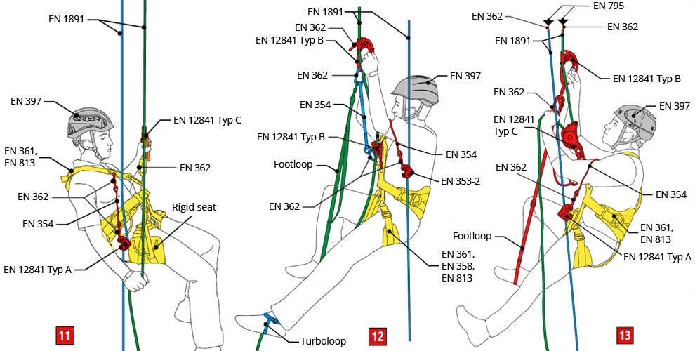 - Working and safety lines must be ropes in accordance with EN 1891 Type A static kernmantle ropes, compatible with the rope adjustment devices. The user must always connect to both lines via the harness, even when a suspension seat is used.