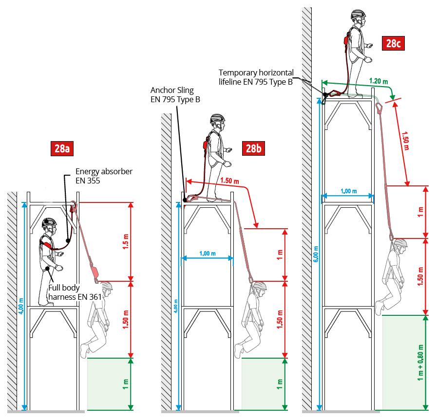 - Fig.28b Climb to the top of the second level and attach the lanyard to the internal side of the floor using an anchor webbing. The limited extension of the absorber (max 100 cm) will stop any falls before the user hits the ground.