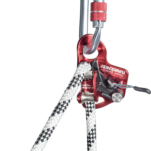 A revolutionary chest ascender that features two proprietary rollers for a smooth interface with the rope. This not only helps with climbing efficiency by making the upward glide much smoother. It also reduces dangerous wear and tear on the device where the rope tends to rub on the body of a traditional ascender. The perfectly profiled closure keeps the rope in line with the body of the device and the rollers to prevent the rope from escaping the device during tight pendulums and traverses. Self-cleaning holes on both the body and the cam help prevent the build up of grit and grime. Thicker body plates and a shaped connection point reduce wear on the device caused by shifting between the device and the connector (especially when used with steel connectors). This also keeps the device more in line with the body during use. The opening mechanism is simple and secure with the ability to lock the device open for easier attachment and a removable pull cord that makes it easier to operate while wearing gloves. The proprietary rollers also allow the Turbochest to be rigged as a locking pulley for light hauling with a max load of 50 kg, 110 lbs. NOTE: This configuration is not intended for hauling or securing of bodies.
