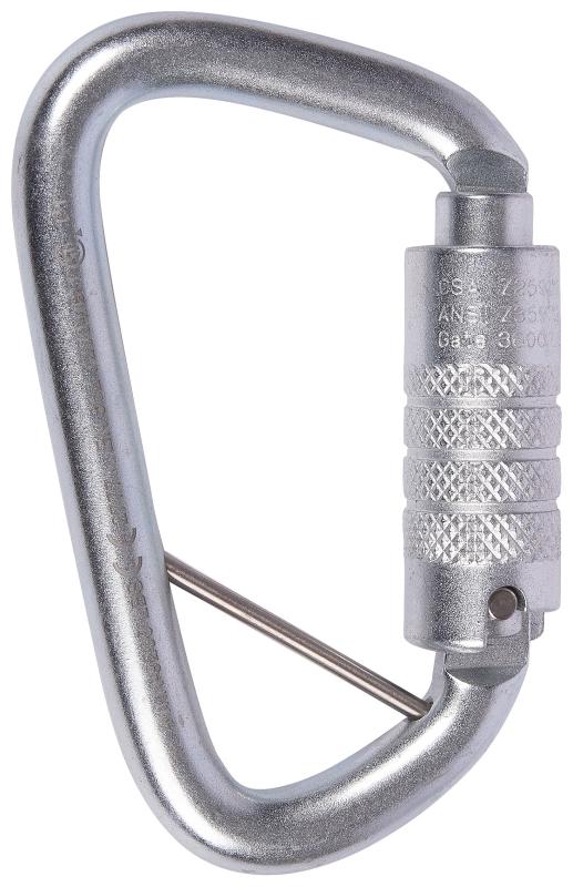 High strength steel carabiner equipped with removable anti-rotation pin.