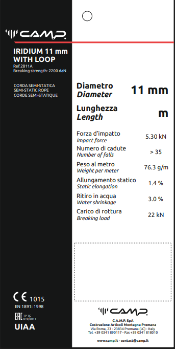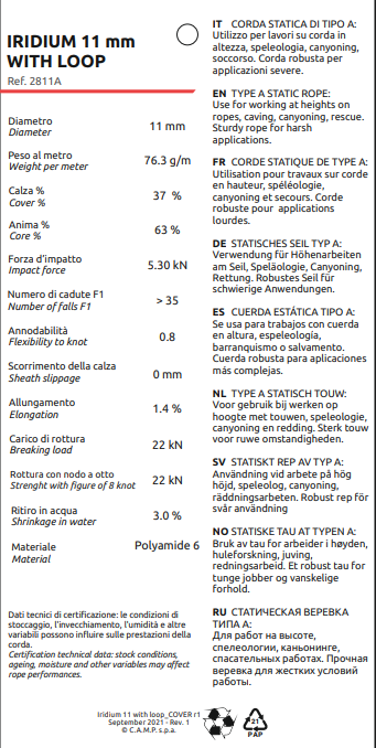 The Iridium 11 mm is the right choice for workers demanding a rope with superior strength that remains compatible with most mechanical devices. A super strong core combines with a 32 carrier sheath for good handling and twisted yarns for a very high level of abrasion resistance. Iridium 11 mm semi-static rope cut to length and terminated with fixed loops with stitching rated to 22 kN at both ends.