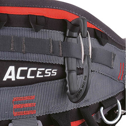 Detachable plastic carabiner for carrying tools on a harness. Maximum load: 5 kg. Rubber strap allows the carabiner to be attached to the structural webbing of any harness. Can also be inserted directly into the special slots on the following CAMP Safety harnesses: Access Sit, Tree Access Evo, GT Sit, GT Turbo, GT ANSI, Golden Top Evo Alu, Golden Top Plus Alu.
