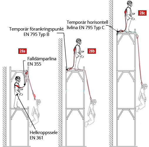 - Fig.28c När den andra nivån är konstruerad kan med fördel en temporär horisontell livlina EN 795 Typ C fästas på tredje våningen för att möjliggöra horisontell rörelsefrihet för användaren. På denna höjd är risken för att falla och slå i marken inte längre ett problem om användaren förblir inkopplad i den temporära horisontella livlinan.