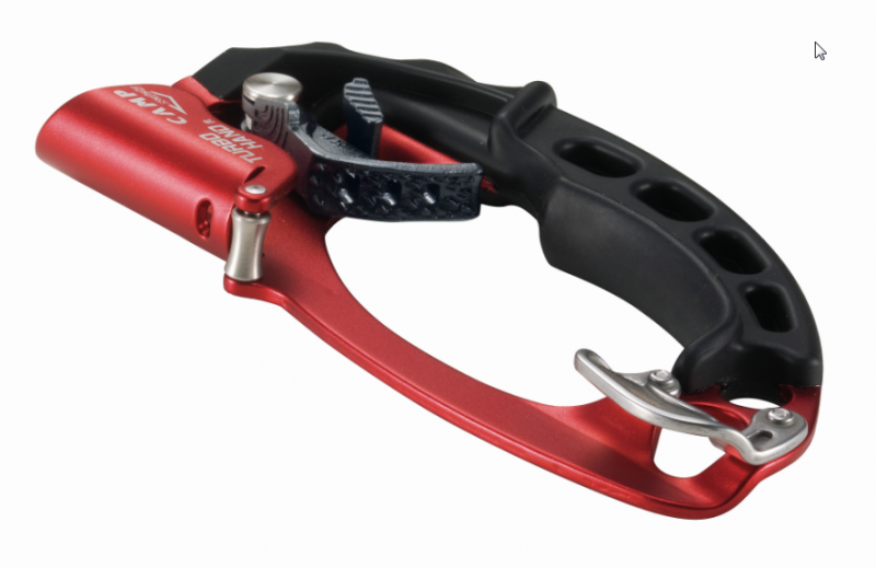 Turbohand Pro ascender är en topp-produkt för effektiv klättring på rep. Den har en unik patenterad rulle, som inte bara hjälper till att klättra effektivt, den gör förflyttning uppåt mycket jämnare, och minskar avsevärt farligt slitage. Den avtagbara repstyrningen längst ner på handtaget justerar linan optimalt för långa uppstigningar. Det ergonomiska gummihandtaget sträcker sig in i den övre delen för att möjliggöra ett dubbel-hands grepp. Innehåller tre stora fästpunkter, två nedre och en högst upp. Repstyrningen i rostfritt stål förstärker huvudfästpunkten för ökat motstånd mot slitage, samt förhindrar att karbinen kommer i kontakt med repet. Den robusta kroppen är konstruerad av 3,5 mm aluminiumlegering. Geometrin är verifierad för traversering. Den tandade låsningen har en speciell slitagebehandling och har dräneringshål för att förhindra att lera och grus fastnar. Låsningen är skyddat på båda sidor för att förhindra oavsiktliga öppningar. Den patenterade rullen gör det också möjligt att rigga ascendern för materiallyft max 50 kg (denna konfiguration är inte avsedd för hissning eller säkring av personer).
